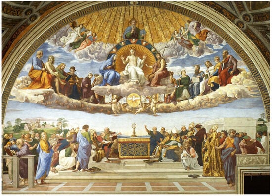 More to the point, in Chapters LVI and LVII, Pacioli explains how to construct a spherical body and to insert it into the five Platonic solids (Pacioli 1956, pp. 107–8). For this reason, the Platonic quintessence was the pentagon, whereas for Pacioli, the dodecahedron was the perfect figure, the embodiment of the circle, which he created using 12 pentagons39. This Platonic conception was embodied in paintings not only for its benefits, owing to the formal reasons already set out above, but also for the psychological factors underlying their symbolism.