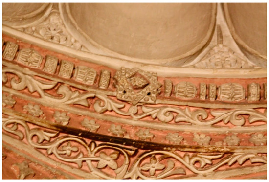 On the other hand, the enhancement of light is not only achieved with the manipulation of its own reflections and the architectural games of light and shadows. The viewer is also suggested by the representation of elements that are considered, due to their characteristics, as sources of brightness. In the decoration of the microcosmic temple, it is very common to find jeweled elements—jewelry style— gems; pearls; and precious stones—sumptuous pieces that accompany and define the characteristics of sacred and royal power (Janes 1998, p. 36).