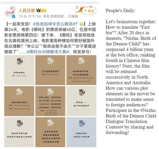 Screenshot of the People’s Daily’s Weibo statement inviting followers to participate in the English translation of Chinese lines from Ne Zha: Birth of the Demon Child. Source: Sina Weibo.