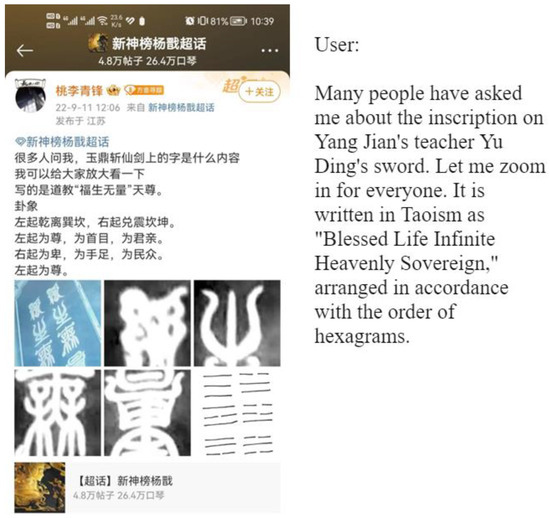 Screenshot of a fan’s post on the Super Topic for New Gods: Yang Jian. In this post, the fan utilizes Taoist knowledge to interpret the meaning of the words and lines on the sword of Yang Jian (Yang Jian’s teacher). Source: Sina Weibo.