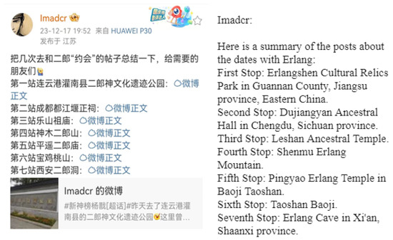 Screenshot illustration of a fan of New Gods: Yang Jian documenting the locations she visited in her “dating” journeys.