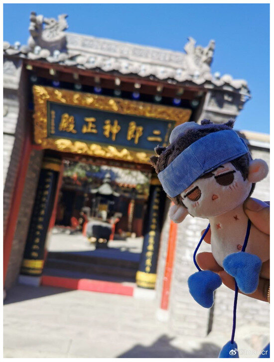 Let us take a look at a photograph taken by a fan during her pilgrimage journey (my use here has been authorized by the fan owners), which could provide further insight into their perspective on “pilgrimage” (Figure 4). In this image, a doll, representing material goods associated with the movie New Gods: Yang Jian, takes center stage, with the traditional sacred site, the “Erlangshen Main Hall”, in the background. This composition suggests that the younger Chinese generation such as the fans of Ne Zha: Birth of the Demon Child and New Gods: Yang Jian recognizes the sacred nature of the pilgrimage sites. However, unlike traditional pilgrimage journeys, which lead to a temporary “other-worldly” experience (Cusack et al. 2019), this sacredness only serves as a necessary element for constructing an imagined intimate relationship, which helps fulfill fans’ secular desires. Deities once confined in temples and shrines as cold stone statues are now transformed by popular culture into adorable plush toys that fans can hold in their hands.