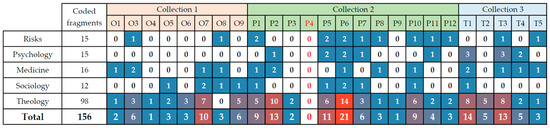 The spectrum of homogeneity and diversity in our analysis is framed by two distinct outliers. The Fourth Prayer of St. Simeon the Metaphrast (P4) is devoid of any coded segments, thereby diverging from the common thematic thread. In stark contrast, the Sixth Prayer of St. Basil the Great (P6) exemplifies diversity with its dense aggregation of twenty-one coded segments, making it the most thematically rich document in terms of discussing the effects of Communion.