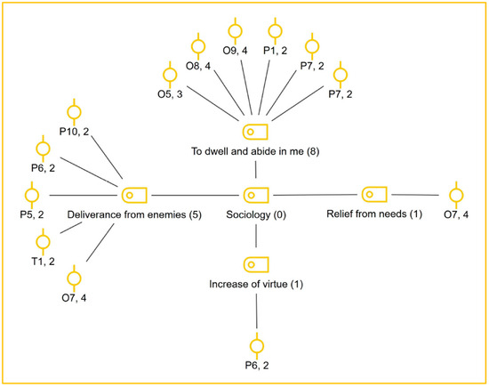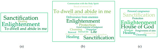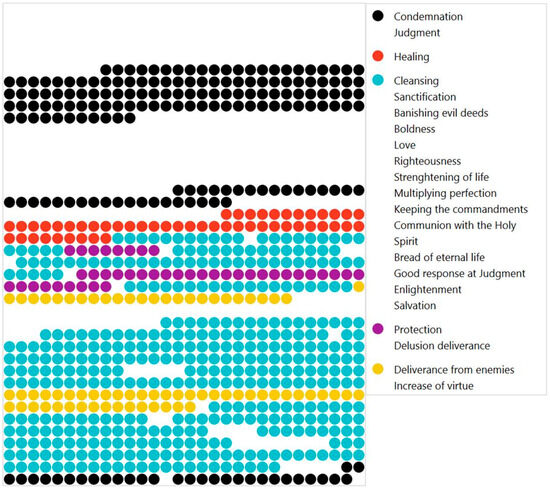 The texts underscore Communion as a source of inner strength and support. This psychological bolstering can help individuals cope with anxiety by providing a sense of stability and resilience in the face of adversity: “But let them be […] a defense and a help and a repulsion of every evil attacker” (Prayer 5). The Sacrament of Communion is portrayed as a means of protection against diabolical forces. Partaking in the sacrament is believed to fortify the mind, creating a psychological shield against negative influences that can contribute to anxiety and fear “for the repulsion of every tempting thought and action of the devil which works spiritually in my fleshly members” (Prayer 6). The texts present the Sacrament of Communion as fostering harmony within the soul, a state that contributes to emotional well-being. The pursuit of wisdom, facilitated by this Sacrament, can enhance psychological resilience and emotional stability, counteracting depressive tendencies: “the peace of my spiritual powers […] the fulfilling of wisdom” (Thanksgiving 1). The Sacrament of Communion’s influence on cognitive function is also mentioned, referencing the illumination of the senses: “Illumine my five senses!” (Thanksgiving 3). This illumination suggests a potential cognitive enhancement, which can represent a real aid in counteracting cognitive decline. Partaking in Christ’s Supper is also associated with the acquisition of wisdom: “Give me understanding” (Thanksgiving 3). This wisdom may have a profound psychological impact, promoting emotional well-being and resilience against anxiety and depression. The abundance of directions can be observed in Figure 8, which provides a visual representation of the various aspects discussed in the text.