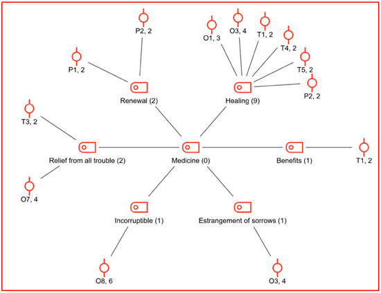 In the intricate tapestry of the Sixth Prayer of St. Basil the Great (P6), a significant portion of the text is devoted to elucidating the manifold effects of Communion. This prayer, a cornerstone in liturgical texts, presents a comprehensive exploration of Communion’s impact, spanning across all five distinct domains. These domains include risks (represented in black), psychological aspects (in purple), medical implications (in red), social dimensions (in yellow), and theological perspectives (in turquoise), each color-coded to facilitate a clearer understanding of their respective representations, as illustrated in Figure 2.