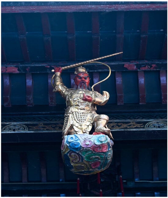 Wang Lingguan 王靈官, also known as Wang Shan 王善, Wang E 王惡, Wang Tianjun (王天君 Lord Wang), and Wang Yuanshuai (王元帥 Marshal Wang), has the status of Sanwu huoche leigong (三五火車雷公 Lord of Thunder), Yushu huofu tianjiang (玉樞火府天將 Jade Pivot Fire Mansion Heavenly General), Zhenwu dadi zuoshi (真武大帝佐使 The general of True Martial Great Emperor), Wubai Lingguan tongshuai (五百靈官統帥 Commander of the five hundred Lingguans), and other identities. In addition, he is probably better known as one of the most important protectors of Daoist temples (Figure 1). Wang Lingguan possesses a ruddy complexion, three eyes, dons armor, and wields a steel whip (Figure 2). He is tasked with judging and punishing evil, safeguarding the ordinary people between heaven and earth. Consequently, he earns admiration, with people praising him as follows: “With three eyes, he observes all affairs; with one whip, he awakens the people of the world 三眼能觀天下事,一鞭驚醒世間人”.