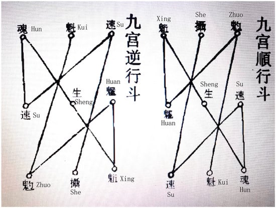 Daoist patterns emulating the orbit of stars and constellations, including nine palaces in sequential order dipper (九宫顺行斗 jiugong shunxing dou) and nine palaces in reverse sequence dipper (九宫逆行斗 jiugong nixing dou). Sourced from Leiting Sanwu Huoche Lingguan Wangyuanshuai Mifa.