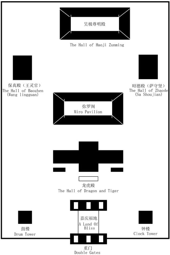 Post-Xuande, the Dade Daoist Temple underwent two additional reconstructions during the Chenghua and Jiajing periods of the Ming Dynasty. According to Dijing jingwulue (帝京景物略 Scenery of the Imperial Capital), authored by Liu Dong 劉侗 and Yu Yizheng 于奕正, “At the onset of the Chenghua period, the emperor commanded the officials to expand the Dade Daoist Temple, renaming it the Palace of Dade Jingling 大德景靈宮, and to erect the Miro Pavilion (弥罗阁 miluo ge) for deity worship” (Liu and Yu 2001, vol. 4, pp. 260–61). The new Miluo Pavilion served a similar purpose to the Jade Emperor Pavilion, resulting in minimal changes to the spatial layout. During the Jiajing period, as the records of the Imperial Tablet of the Palace of Dade Jingling (御製大德景靈宫碑 Yuzhi Dade jinglinggong bei), new additions included the Hall of Haoji Zunming 昊极尊明殿 dedicated to the Jade Emperor’s parents and the Hall of Dragon and Tiger (龙虎殿 Longhu dian) dedicated to Zhenwu 真武 (Shen 1982, vol. 18, pp. 197–98). Clearly, the Daoist Temple incorporated some elements not present in the original rituals. Nonetheless, the Miro Pavilion for the Jade Emperor and the Halls of Baozhen 保真殿 and Zhaode 昭德殿 dedicated to Wang Lingguan and Sa Shoujian, respectively, still preserved evident markers of ritual reproduction as depicted in the narrative texts (Figure 5).