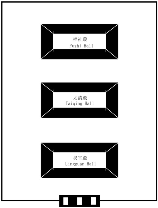 The architectural design of such Daoist temples was still associated with Zhou Side, renowned for his mastery of Wang Lingguan’s Mifa. In the 10th year of the Zhengtong era (1445), when Zhou Side sought retirement at the age of 86, Emperor Zhengtong specifically ordered the establishment of the Taiqing Daoist Temple 太清觀 on Fenghuang Mountain5 to serve as his retirement abode (Xi 1998, vol. 19, pp. 175–76). According to the Encyclopedia of Beijing—Mentougou Volume (北京百科全書·門頭溝卷 Beijing Baikequanshu—Mentougoujuan)—the Daoist Temple housed three main halls: the first being Lingguan Hall dedicated to the Daoist protector Wang Lingguan, the second Taiqing Hall to the Supreme Venerable Sovereign (太上老君 Taishang Laojun), and the third Fuzhi Hall 福祉殿 to Zhenwu and the emperor (Beijing Encyclopedia Editorial Committee 2001, p. 288). Notably, Taiqing lacked a hall for Sa Shoujian, placing the Lingguan Hall prominently at the Daoist Temple’s forefront (Figure 6). Approximately a decade later, in 1456, Beijing’s renowned Baiyun Daoist Temple 白雲觀 also established a Lingguan Hall (Li 2003, p. 72). Although Zhou Side had passed, it was his disciples who continued constructing Lingguan Halls (Koyanagi 1934, pp. 105–12). This suggests that the spatial organization of Lingguan Hall and its role in delineating Wang Lingguan’s imagery as a Daoist protector were significantly influenced by Zhou Side and his Daoist lineage.