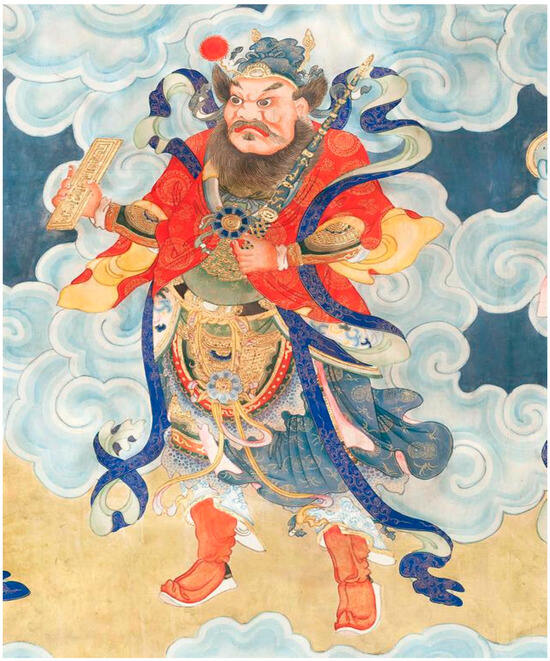 Yongle Emperor established the Tianjiang Temple in Beijing, marking the first palace dedicated to Wang Lingguan. Successive emperors, including Xuande and Chenghua, renamed and expanded it into the Dade Daoist Temple 大德觀 and Dade Jingling Palace, respectively, heralding an era of flourishing for the Daoist temple. From its inception as the Tianjiang Temple to its evolution into the Palace of Dade Jingling, it served fundamentally as an imperial sanctuary, essentially the royal inner shrine. Xu Youzhen 徐有貞 of the Ming Dynasty highlighted that the shrine of Dade was the state’s secret shrine (Xu 1987, vol. 3, p. 116). Beyond the Palace of Dade Jingling, the Jiajing Emperor also established the Hall of Qin’an 欽安殿 within the Imperial City to honor Zhenwu. Wang Lingguan, recognized as one of the twelve Thunder Generals, was also depicted in the murals of this hall (Figure 8).