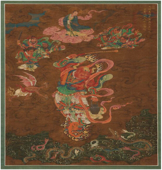 Fueled by the devotion of Ming emperors, their consorts, Daoist priests, eunuchs, and vassal kings intimately linked with the royal court, an early community of believers emerged, significantly bolstering the cult of Wang Lingguan. The Metropolitan Museum of Art houses a Ming Dynasty portrait of Wang Lingguan (Figure 9), wherein a line of small script documents the following: “On the first day of April in the 21st year of the Jiajing era, Imperial Consort Shen commissioned this painting 大明嘉靖壬寅歲孟夏朔旦, 皇貴妃沈氏命畫工繪施”. This inscription underscores the deep influence of Wang Lingguan’s belief even among the concubines of Emperor Jiajing.