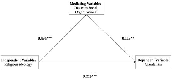 Equation (2) represents the positive effect of the party’s religious ideology on its ties with social organizations. Equation (3) represents the positive effect of ties with social organizations on clientelism. If the variable of ties with social organizations is acting as a mediator, then should be significant, and under the control of , should also be significant. represents the mediating effect of the variable of ties with social organizations on clientelism.