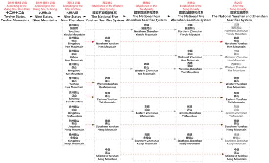 In the later period of the Northern and Southern dynasties, with the strengthening trend of national unity, the Zhenshan sacrificial ceremony also began to develop, and the main driving force for this new development was the improvement in the national mountain and river sacrificial system. The “Yizhen” 沂鎮, “Kuaiji zhen” 會稽鎮, and “Yiwulv zhen” 醫巫閭鎮 sacrificial ceremonies appeared in the Northern Qi dynasty and Northern Zhou dynasty. This trend of development continued in the Sui dynasty, which promoted the pioneering changes of Zhenshan on the basis of previous dynasties, formed the four major Zhenshan theories of the Sui dynasty, and created a complete national mountain sacrificial system. According to the “Annals of Rites” in the Book of Sui《隋書-禮儀志》, in the 14th year of Kaihuang (開皇十四年 594 AD), “an edict was issued to Yi Mountain as Eastern Zhen, Kuaiji Mountain as Southern Zhen, Yiwulv Mountain as Northern Zhen, and Huoshan as Jizhou Zhen”, “ 詔東鎮沂山,南鎮會稽山,北鎮醫無閭山,冀州鎮霍山,並就山立祠 ”. In addition to the Five Sacred Mountains system, the other four Zhenshan of the Nine Zhenshan of the Rites of Zhou were reincorporated, and the Four Zhenshan system was established. Zhenshan began to rise to the level of a national ritual system, and the injection of related sacrificial rituals such as temple construction and ritual gave Zhenshan a whole new appearance. During the Tianbao天寶 period of the Tang dynasty, the gods of the mountains and rivers were enfeoffed, and Huoshan was also included, achieving a position equal to the four major Zhenshan and developing the Zhenshan pattern. Until the Song dynasty, Huoshan was officially included in the national ritual system, and the Zhenshan sacrificial system was referred to as the Five Zhenshan. For example, the “Five Zhen” were recorded in the Zhenghe Xinyi《政和新儀》, and the completeness and institutionalization of the Zhenshan sacrificial rituals directly constructed the spiritual core of the five major Zhenshan patterns, eventually forming a complete system of national Zhenshan sacrificial rituals (Zhang 2012). During the Tang dynasty, the sacrificial level of the Five Zhen was also determined. In the second year of Yonghui (永徽二年 651 A), “Yue Zhen Hai Du” 嶽鎮海瀆 was clearly designated as the midsacrifice level in the Yonghui Decree, and this position remained unchanged throughout history (Figure 1).