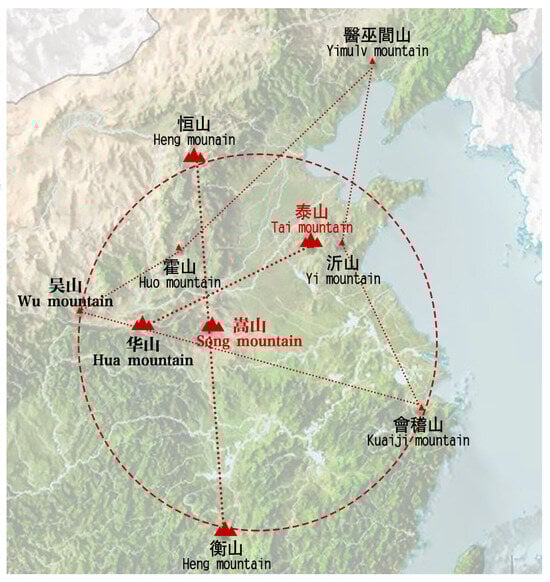 In the process of the localization of Zhenshan, regional Zhenshan and urban Zhenshan were gradually generated, and the national ritual system of Zhenshan and local Zhenshan were constructed in parallel, building a multi-level and multi-scale geospatial system comprising the national Zhenshan 國家鎮山, regional Zhenshan 區域鎮山, and urban Zhenshan 城市鎮山 at three levels. National Zhenshan refers to the ten Zhenshan included in the sacrificial system (Figure 2). In addition, Song Mountain 嵩山 is the middle mountain in the country, so it is often called the national Zhenshan by later generations, and together with Tai Mountain, it is called “Songdai” 嵩岱, which is often regarded as the national Zhenshan and the representative of the orthodox regime in the Central Plains of china.