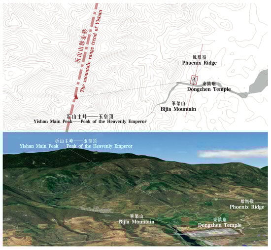 Unlike Western worship spaces dominated by gods and spirits, China’s Yue and Zhen temples are not only spaces for the worship of gods and spirits but also spaces to worship the form and trend of the mountain itself. The construction of a Zhen temple combines geographic and humanistic information to observe the mountain ranges, forming such cultural phenomena as the Wuyue Zhenxing map 五嶽真形圖 under the guidance of Taoist aesthetics. In terms of spatial order between temples and mountains, there are significant differences between Yue and Zhen temples. The setting of the Five Yue Temples and their relationship with the various mountains mainly depend on the effect of “observing and worshipping from a distance” 望祀 (Yang 2011). Ancient people worshipped the gods of the five mountains at the Yue temples, and the main peaks of the mountains became the focus of their worship. Except for the Northern Yue Temple built on the main peak, each temple is located at a certain distance from the mountain, highlighting the towering and sacred nature of the mountain with an appropriate height-to-distance ratio, forming a worship space pattern of looking at the mountain from afar and offering sacrifices. Moreover, the main peak of the mountain is often the endpoint of the central axis of each temple, forming a dignified spatial order of “mountain to temple” (Figure 4).