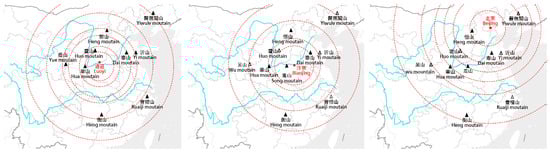 At the scale of national territory, the legitimacy of political power was demonstrated through the “seeking a central position” model of selecting the location of the capital city among the Nine Zhenshan, constituting a metaphorically constrained cultic spatial system in which the capital city dynamically seeks a central location among multiple Zhenshan at the geospatial scale of the national territory. According to L ü Shi Chun Qiu “Shen Shi”,《呂氏春秋·慎勢》, the ancient king chose the center of the world to establish his country, “古之王者,擇天下之中而立國”. This idea stems from the primitive worship of the center as a place for gods, the culture of seeking doctrine of the mean, and the aesthetics of mediocrity and harmony, as well as a series of concepts. The Yue Zhen Hai Du 嶽鎮海瀆 system, which gradually matured on the national territory scale after the Han dynasty, constructed spatial criteria that centered the national capital around the relative central position of spatial layout. With the migration of the national capital, the Yue Zhen Hai Du system on the national territory scale was also undergoing changes (Mao and Cheng 2020). Among them, Zhenshan is a relatively stable system in the Yue Zhen Hai Du system. The national capital takes the geographical center opposite to the national Zhenshan to represent the center of the territory, laying the foundation for the location selection method of taking the national Zhenshan as the capital and forming a spatial order of “being in the center” of the national geography. At the same time, the spatial metaphor of strengthening the legitimacy of political power is achieved by elevating the political status close to the capital city of Zhenshan. During the Tang dynasty and Northern Song dynasty, Song Mountain 嵩山 was revered as the highest of the Five Sacred Mountains due to its proximity to the eastern capitals of Luoyang and Bianjing. During the Southern Song dynasty, due to the relocation of the capital to the south, emphasis was placed on Heng Mountain. After the Ming dynasty, Beijing became the political center, and Northern Zhenshan Yiwulv Mountain held a higher status than other Zhenshan. This phenomenon reflects the dependence of the geographic political center on Zhenshan. Seeking the center in Zhenshan is a political system product of the “rule of law” society constructed by the coercive force centered on the will of the monarch, forming a geographical metaphor for the complete control of local areas by centralized and authoritarian monarchs, and consolidating the unified political order of the country (Figure 6).