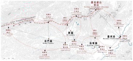 In the construction of Zhenshan and urban metaphorical constrained worship space, urban site selection and urban axis shaping are two main approaches based on the Zhenshan system. In terms of urban site selection, some cities imitate the national five Yueshan and four Zhenshan, selecting one Zhenshan from each of the city’s multiple directions, forming a phenomenon of multiple Zhenshan. The city site selection is surrounded by the Zhenshan, strengthening the political metaphor of “seeking correction in the middle” and “connecting the god in the middle”. For example, Huizhou prefecture 徽州府 and its counties are all attached to the Huang Mountains 黃山, and most of them are in a multi-Zhenshan pattern. In Huizhou prefecture, Xiuning County 休寧縣, Yi County 黟縣, and Qimen County 祁門縣, each city is located in the relative center of the multi-Zhenshan, forming a spatial pattern of “city–mountain” worship built by the multi-Zhenshan (Figure 7).