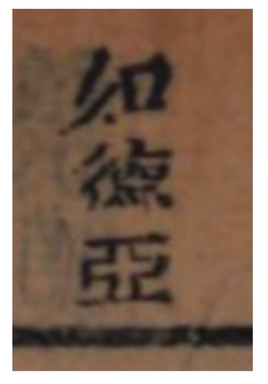 Based on the evident traces of modification in Figure 4 and Figure 5, it can be concluded that in the later reprinted, revised version, the Chinese words “如德亞” (“Ru-de-ya”) were modified to “罷德肋” (“Ba-de-le”). However, the characters “罷德” (“Ba-de”) are clearly visible, whereas the character “肋” (“le”) is no longer legible. The 1712 first edition and subsequent reprints were likely derived from the same woodcut version. Due to multiple printings, the text and images in the later editions are not as clear as those in the first edition, and this specific section underwent modification. This suggests that the printer, who utilized the woodcut block, made subsequent modifications that led to the lack of clarity of the Chinese characters on the woodblock.