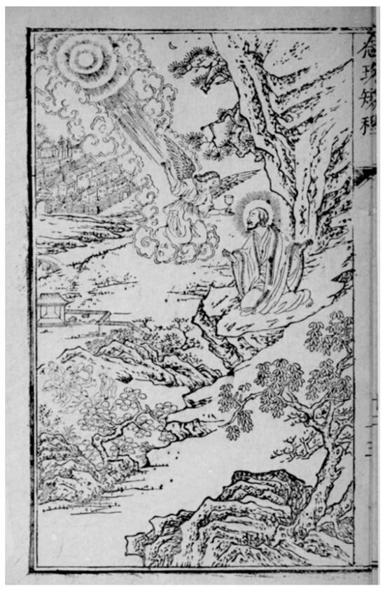 The text of “The Life of Jesus” in Tongjian extensively relies on Ferreira’s Guicheng, except for the section concerning Jesus’ Passion, which is sourced from Pantoja’s Shimo. In Ferreira’s book, preceding the mentioned identical passage, there is an illustration titled “Jesus Praying” (Figure 6). This image portrays Jesus kneeling at the edge of a cliff, deeply engaged in prayer, while an angel emerges from the clouds above.