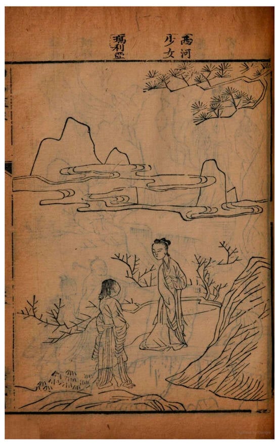 Illustration of “The West River Maiden and the Virgin Mary” from Tongjian (). The above heading states the names of the two individuals in the image: “Ma-li-ya” 瑪利亞 (the Virgin Mary) on the left and “Xihe Shaonu” 西河少女 (the West River Maiden) on the right.