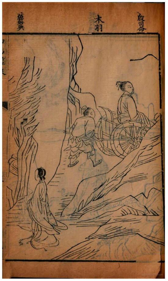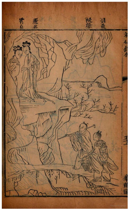 In Figure 9, the depicted group of immortals consists not only of the Virgin Mary and the West River Maiden but also includes the following Taoist immortals: Liu Chen 劉晨; Ruan Zhao 阮肇; Li Ying 麗英; Zhen Zhen 貞貞; Yin Siming 殷司命; Lu Miaodian 魯妙典; and Yin Xueqiao 尹雪翹. Upon comparing these immortal stories in the Huang’s 1795 critical edition with their respective images, the following findings were observed: (1) With the exception of Yin Xueqiao, all the character have their own unique legendary tales, all of which take place after the narrative of the story “The Life of Jesus”. (2) The 1712 first edition of Tongjian features a series of illustrations that correspond to the individual immortal stories following the “Image of Jesus” (Figure 10 and Figure 11). (3) In Huang’s critical edition, all the mentioned immortal images are integrated together and placed on a single page, as seen in Figure 9.