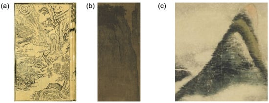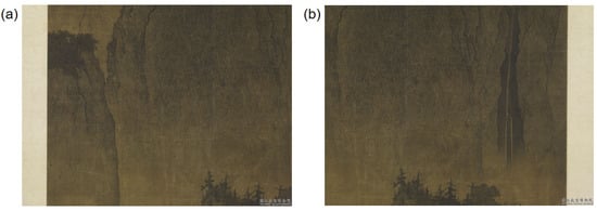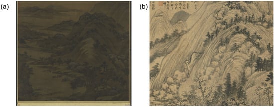 In the practice of depicting natural landscapes, Chinese literati painters formed a unique language of texture patterns composed of brushstrokes by summarizing and abstracting the different geological features, which was referred to as “Cunfa 皴法”. The different types of Cunfa emerged with variations in topography involving using a brush to create short and pointed strokes that resemble raindrops, aiming to portray the grandeur and solidity of rocks. For instance, in the painting “Traveling through Streams and Mountains Painting 溪山行旅圖” by Fan Kuan (950–1032), he outlined the contours of the rocks with bold short lines at first and used a continuous series of “Yudiancun” to present the weightiness of the landscape (Figure 1).