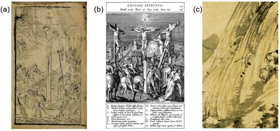 Comparison between the “Pima Cun” in “Crucifixion” and Scholar Paintings. (a) Crucifixion (drawn from ), (b) Crucifixion (drawn from ), (c) Huang Gongwang, The part of Dwelling in the Fu-chun Mountains (1350), 33 × 369.9 cm. Courtesy of the National palace museum, Taibei.