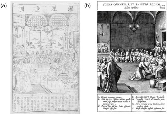 The Chinese landscape in the “Maundy Service”. (a) Christ Washing the Disciples’ Feet (drawn from ). (b) Christ Washing the Disciples’ Feet (drawn from ).