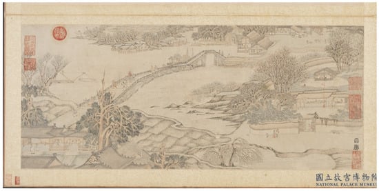Besides the Chinese literati painting technique of the “Yudiancun”, the “Pimacun” also employed to depict the scenes of Christian paintings in the “Song nianzhu guicheng” illustrations. “Pimacun” is a common artistic language in Chinese landscape painting, which is composed of “Chang pimacun 長披麻皴” with long lines and “Duan pimacun 短披麻皴”. with short lines. The “Yudiancun” was often used to depict the basic appearance of the southern Chinese mountains, and Dong Yuan 董源, from the 9th century, is a representative figure of the “Duan pimacun” technique. In his painting “Residents on the Outskirts of the Capital 龍宿郊民圖”, the “Duan pimacun 短披麻皴” is widely used to depict the light and shadow and the three-dimensionality of the rocks, which aptly portrays the natural scenery of southern China. Besides that, Huang Gongwang (1269–1354) is a representative figure of the “Chang pimacun” technique. His painting “Dwelling in the Fu-chun Mountains 富春山居圖” depicts the beautiful scenery around the Fuchun River in Zhejiang in a long scroll format. The “Chang pimacun technique” is arranged from top to bottom along the direction of the mountains, and the variation in the density of the lines and the intensity of the ink felicitously portrays the outline of these rocks (Figure 4).
