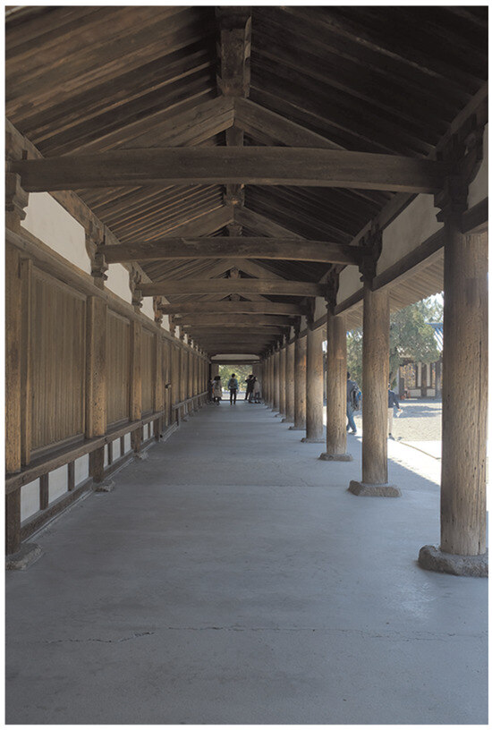 On the other side, despite limited information from archaeological and visual materials, insights into the design of early enclosing corridor structures can be drawn from the Zhaoyang Hall 昭陽殿 compound, the main audience building of the Northern Qi palace built in 539 at Ye. A mid-Tang source describes its eastern and western corridors as having elongated windows, likely installed along the rear walls, to accommodate court musicians during ceremonies.3 The presence of windows strongly indicates that the corridors may not have significant pictorial programs. Between the late-sixth and early-seventh centuries, the extensive use of windowed corridors in religious and palatial compounds is evidenced by the creation of the term xuanlang 軒廊 (“windowed corridor”), coined in early Tang literature to describe this distinctive architectural element.4 The seventh-century Daoist monastic code, Sandong fengdao kejie 三洞奉道科戒 (Rules and Precepts for Worshipping the Dao), includes guidelines for monastery buildings in Section 4 Zhiguanpin 置觀品 (Setting Up Monasteries). It stipulates that a xuanlang structure should be built for passageways and circumambulation around sanctuaries, halls, pavilions, and terraces within a cloister, encircling all four sides (Kohn 2004, p. 95). Built in 605, Qianyang Hall 乾陽殿, the main audience building of Emperor Sui Yangdi’s 隋煬帝 Ziwei Palace 紫微宮 at Luoyang, along with several other significant ceremonial-sacrificial compounds within the palace, were characterized by a xuanlang-enclosed design (Wei and Du 2006, pp. 8–10). Arguably the best example of the xuanlang structure, although located outside China, is the early eighth-century corridor that encloses the western compound of Hōryūji 法隆寺 in Ikaruga prefecture, Japan (Figure 1).