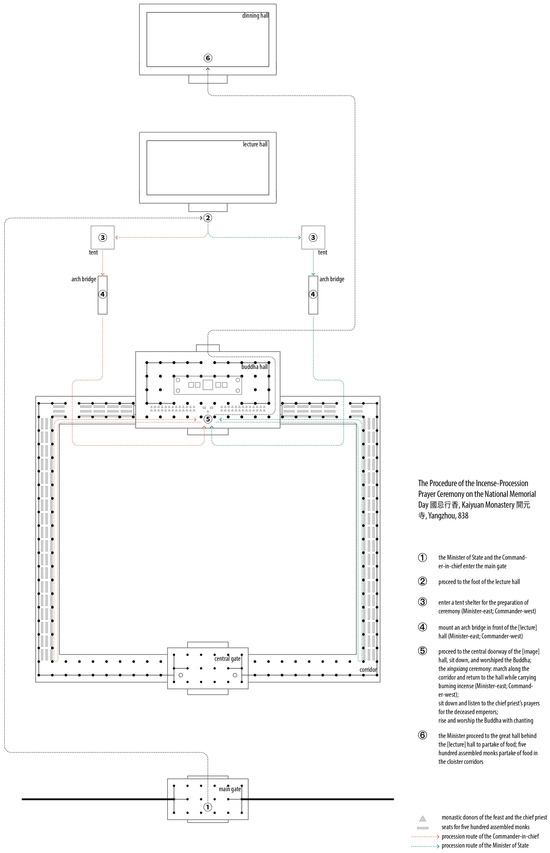 The last significant development, and likely the most critical factor contributing to the consecration of the corridor, was the integration of the maigre feast into the Tang state sacrificial system, for the purpose of praying for the afterlife well-being of the deceased emperors. Adding Buddhist rituals in service of national mourning dates back to 582, when Emperor Sui Wendi ordered the construction of Buddhist monasteries in four cities. On the anniversary of his father’s death, these monasteries were to conduct a series of rituals, including the maigre feast, image making, perambulation (Skt. Caṅkrama) or circumambulation (Skt. Pradakśiṇā), and repentance through observing the eight precepts (Fei 1924–1933, 107b29–c15). The Tang rulers gave this imperial practice greater emphasis. By 727, this ceremony had been enacted nationwide and was subsequently codified into the administrative law, i.e., Tang Liu Dian 唐六典, as a government-hosted observance (Li 1992, p. 217). Known as guoji xingxiang 國忌行香 (Incense-Procession Prayer Ceremony on the National Memorial Day), it was prescribed to be performed annually in official monasteries across eighty-one prefectures throughout China.9