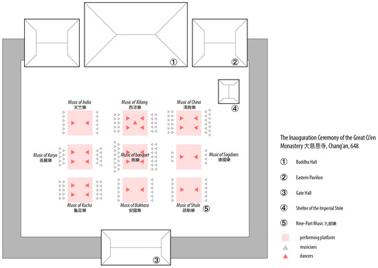 The Inauguration Ceremony of Great Ci’en Monastery at 648. The exact number of musicians and dancers for each band of Nine-Part Music is provided in (Zuo 2010, pp. 93–98). However, as no evidence suggests the spatial order of the nine bands, the arrangement presented here is merely the author’s hypothetical reconstruction. In this reconstruction, the first band, yanyue 燕樂, is positioned in the center because the Dance of Triumph (pozheng wu), which is a part of the yanyue repertory, was actually performed in the 648 inauguration celebration. The other bands are arranged enumeratively, starting from the northeastern corner and proceeding counter-clockwise.