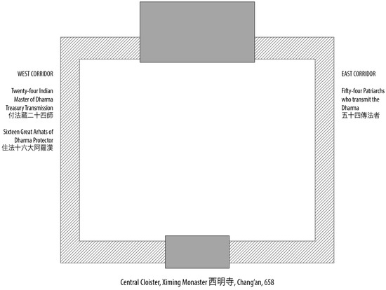 A theoretical illustration of the pictorial program of the central cloister’s corridors, Ximing Monastery, Chang’an (author’s reconstruction).