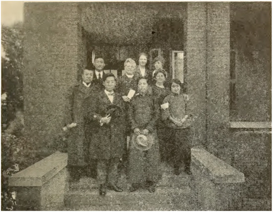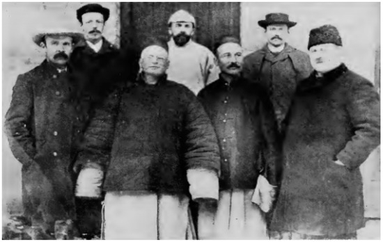 In 1899, Donald MacGillivray joined the C.L.S. and formally became a professional editor and writer. The method of preaching changed to writing. At this time, Canada had just entered a period of economic prosperity, and became more supportive of missionary activities in China. In addition to preaching tours and medical missions, the Presbyterian Church fully supported his missionary work in China; “the Christian Literature Society for China is in great demand, and our missionary committee will allow Mr. Donald MacGillivray to freely translate and prepare Chinese books related to the Christian Literature Society for China” (Gandier 1902, p. 46). In this regard, The Presbyterian Church of Canada raised his salary in China from USD 500 a year to USD 39,600, which is a huge difference. Figure 4 was a group photo of D. MacGillivray and his colleagues from the Christian Literature Society for China, who constituted China’s intellectual elite at that time.
