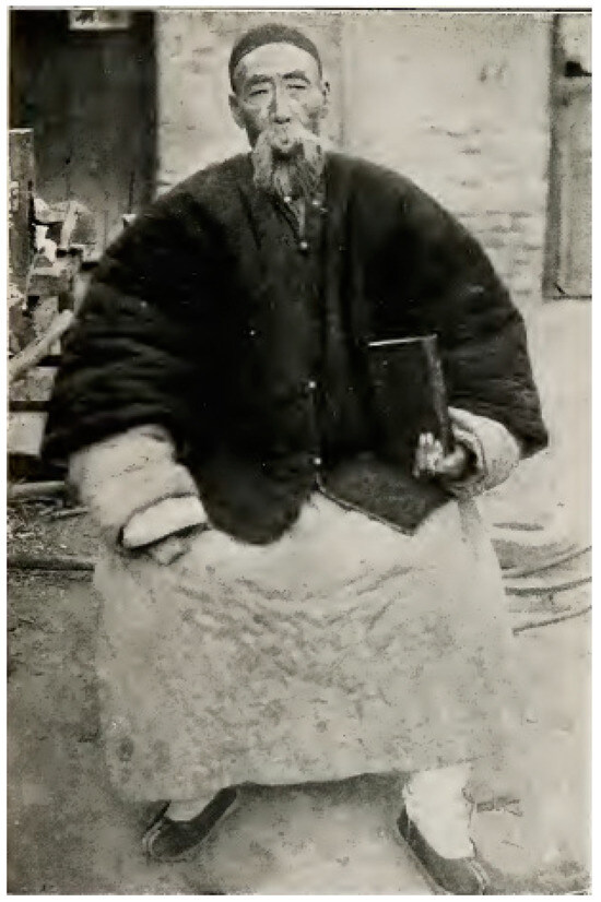 Free healthcare allowed Canadian missionaries to attract their first converts. In 1889, Donald MacGillivray, Jonathan Goforth, and others came down from Linqing, Shandong, along the Wei River to Neihuang County (内黄县) of Changte Prefecture and to Hsunhsien of Weihwei Prefecture (卫辉府), where they gave medical treatment and preached to the local people. At the beginning, due to the hostility of the local gentry, they could only rent a room at the inn to preach, staying for about ten days, then moving to another place. However, missionaries preached disrespect to ancestors, did not worship parents, and believed only in Christ as Lord, and the people psychologically rejected their teachings. In view of this, missionaries could gain trust only by treating the poor. In 1889, Chou Lao Chang (周老常), the first blind convert in North Honan, met Jonathan Goforth by chance at the market, and a year later, James F. Smith performed cataract surgery on him. After Chou Lao Chang was cured of his eye disease, he bought a Bible and converted to Christ, which was considered by Canadian missionaries as “a modern illustration of that greatest of all miracles, transformed personality” (United Church of Canada and Board of Foreign Missions 1928, p. 111). Figure 3 was a portrait of Chou Lao Chang, holding a Bible in his hand.