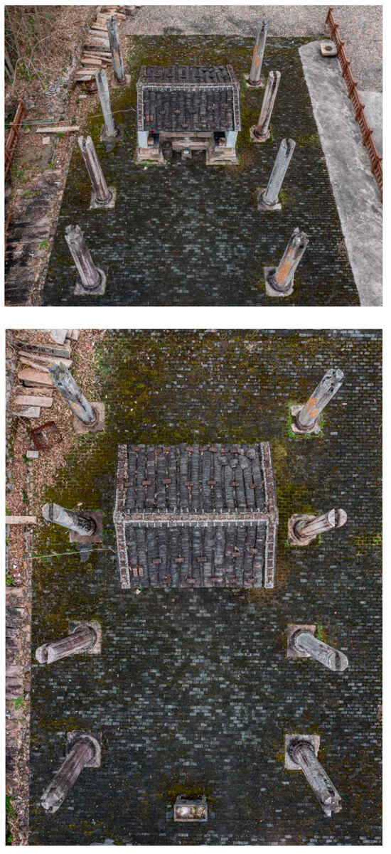 There are currently eight stone columns, a Sumeru stone podium (symbolic of Buddhist Mount Sumeru) 须弥座, as well as stone grooves, stone tablets, and remaining stone architectural elements at the site. The features and carving techniques of the stone columns and Sumeru platform are consistent with other Buddhist temple remains from the Song Dynasty in the Changxi River Basin (Liu 2018). They are well preserved and located in their original positions without changes throughout the ages, indicating the feasibility of architectural reconstruction.