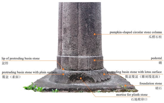 Each stone column at the site is about 3520 mm high and is composed of two parts: The column base 柱础 and the column shaft 柱身 (Figure 2). The plan of the column stone is about 1080 mm square, with a central protruding basin stone 覆盆 that is about 100 mm high. It has a mortise for installing a plinth stone 石地栿, and the surface of the protruding basin is also carved with lotus patterns, which is similar to the lotus style “铺地莲华” described in Yingzao Fashi (Figure 3). The column shaft can be divided into the pedestal 礩 and the body. The pedestal is approximately 140 mm high with a diameter of about 550 mm. The surface of the body is carved like a pumpkin shape. The middle part of the body has a diameter of about 496 mm, tapering to approximately 455 mm at the top. There is a mortise at the top of the column for installing longitudinal architraves (lan’e 阑额), measuring approximately 370 mm in height and 140 mm in width. Four corner columns have cross-shaped mortises, while the other four columns have line-shaped mortises, indicating the longitudinal architraves were installed in a circle at the column tops.