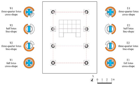 The eight stone columns remaining in the main hall are positioned from the northwest to the southeast, arranged in two columns with four rows, forming a layout of one-bay wide and three-bay deep. The concave-shaped Sumeru platform is located in the middle of the last two bays in a depth-wide direction (Figure 1).