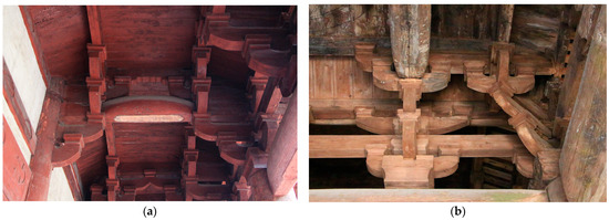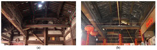 While there are no early architectural remains reflecting this technique in the Changxi River Basin or even in Fujian, similar cases of using massive internal longitudinal architraves to support upper structures can be widely found in the mansion halls of residential houses from the Ming Dynasty in eastern Fujian. Locally, internal longitudinal architraves are referred to as kangliang 扛梁 (Figure 8) (Ruan 2016, pp. 104–8), possibly indicating the continuity and evolution of corresponding beam-bearing techniques in the region.
