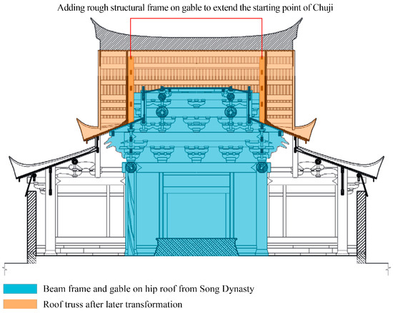 In the main hall of the Chen Taiwei Palace, specifically its section from the Song Dynasty, two additional frames were positioned in the range of the original single bay, and the space between intercolumnar bracket sets 补间铺作 near the two gables. Then frames on two gables were set to extend the starting point of the chuji. The original location of the bargeboard was outside the axis of the outer row of columns. The roof truss was enlarged through subsequent renovations, which resulted in the original Song’s gable frame and bargeboard being concealed within the massive roof truss. The rough structural framework over the middle bracket sets supports two eave rafters, simultaneously extending the bargeboard beyond the original Song structure, forming the roof and the massive bargeboard to cover the entire frame (Figure 6).