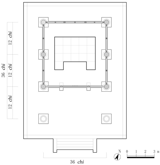 At this time, the depth of each bay is divided into two step frames 二步架, thus making the total depth six step frames 六步架. Each frame length 平长 is 36/6 = 6 chi, which is precisely in accordance with the rafter specifications 用椽之制 outlined in Volume Five of the Song Dynasty’s architectural standard Yingzao Fashi 营造法式 (Wang 2023, p. 520).