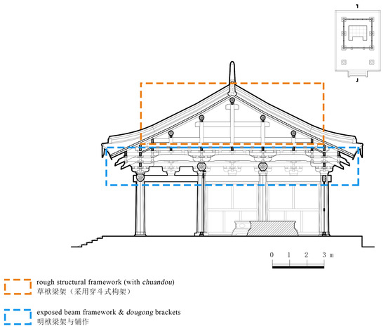 The patterns recorded in Volume Thirty-One of Yingzao Fashi (Wang 2023, pp. 1872–93) point to two types of timber frame structures prevalent during the Song Dynasty, namely diange-style structure 殿阁式构架 and tingtang-style structure 厅堂式构架.3 Since Liang Sicheng’s annotations on Yingzao Fashi, research on the characteristics and differences of these two types of structures has been one of the central topics in the discussion of ancient Chinese architectural history. Scholars such as Chen Mingda (Chen 1981, pp. 107–17), Fu Xinian (Fu 2008, pp. 453–59), and Pan Guxi (Pan and He 2005, pp. 23–29) have extensively discussed this matter. Zhang Shiqing (S. Zhang 2012a, p. 119), combining previous research, provides three key indicators for distinguishing between these two types of structures: Firstly, in terms of structural logic, diange-style structure and tingtang-style structure are characterized by horizontal layering and vertical framing connections, respectively. Secondly, in terms of the relationship between cross beams 梁栿 and puzuo (i.e., bracket sets) 铺作, diange-style structure uses two sets of corss beams: the upper layer of rough (i.e., unfinished) structural framework (concealed by a ceiling) 草栿梁架 is pressed on the bracket sets, and the lower layer of exposed beam framework (not concealed by a ceiling) 明栿梁架 is hauled into bracket sets. On the other hand, a tingtang-style structure only uses an exposed beam framework. Thirdly, in terms of the connection between beams and columns, in diange-style structure, columns and beams are indirectly connected through bracket sets, while in tingtang-style structure, internal columns are raised, beam tails are inserted into the columns, and beams and columns are directly tied together. These three indicators are essential for distinguishing between typical diange-style structure and tingtang-style structure.