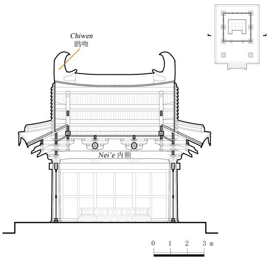 Original materials such as tiles and small woodwork 小木作 components from the Song Dynasty in Fujian are almost non-existent. In light of this, the reconstruction plan’s imagery for the chiwen 鸱吻 is referenced from the precious physical objects of Southern Song found in the Shen Pavilion of the Ganlu Temple in Taining (B. Zhang 1982, p. 128). While the door and window styles tentatively adopt common Song Dynasty patterns, which are shown in Yingzao Fashi (Pan and He 2005, pp. 110–19).