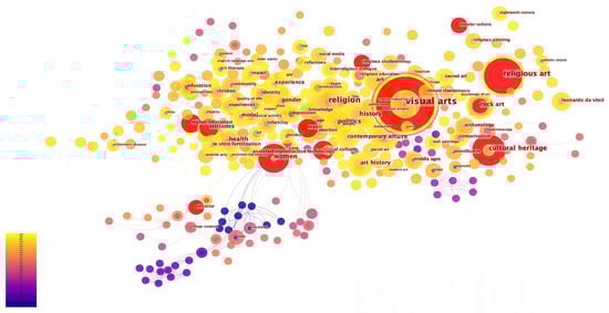 The keyword visualization map presents the co-occurrence network and frequency of research keywords in the field (Figure 1). The dimension of each node correlates with the frequency at which each keyword appears, while the connections between nodes delineate the relational network indicating where keywords co-occur. The research on religious visual arts has formed two main research networks. At the top are research hotspots that have emerged in recent years. Apart from the search words (visual arts and religious art), the keywords that constitute the network include cultural heritage, history, women, and others. The keyword network positioned in the lower-left area of the diagram is also relatively early in terms of research time and includes keywords like behavior, body, and prevalence. From the frequency of appearance of keywords, the top 10 are ranked as follows: visual arts (75 times), religion (37 times), religious art (32 times), cultural heritage (20 times), women (17 times), politics (16 times), history (16 times), culture (15 times), and health (14 times). High-frequency keywords in religion and visual arts research indicate that researchers have paid close attention to these research topics.