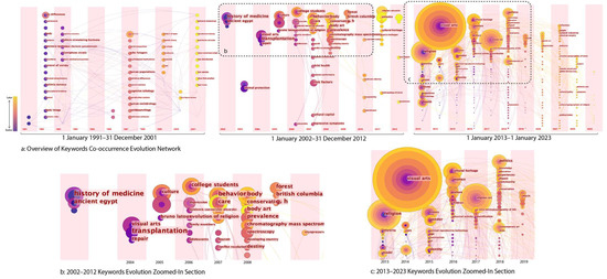 We categorized the literature on religious visual arts into three distinct time periods to assess their evolution (Figure 2). Keywords that appear more frequently are depicted as larger nodes and changes in their occurrence over time are indicated by the nodes’ color transitions. By comparing these three periods and examining the networks’ “Timezone” with interconnected keywords, we can trace the development of research topics within the domain of religious visual arts. The complexity of the network configuration has increased over time. Before 2001, the focus was primarily on sex differences, control of society, and body image. While visual arts emerged as a notable keyword within the field in 1997, it did not become part of a significant network until 2014. Between 2002 to 2012, there was an expansion in the field, including topics such as the history of medicine and transplantation. After 2007, themes related to performance and body art gradually gained attention. From 2013 to 2023, there was a marked shift in research focus, with visual arts becoming a central keyword and intertwining with religion and religious arts to form intricate networks of research topics. This trend illustrates that the keyword networks in religion and visual arts have matured, with stable sub-networks contributing to a cohesive intellectual framework.