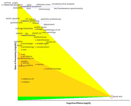 The analysis presented in Figure 4 indicates that topics associated with the seed term visual arts fall into medium and high categories in terms of processing ease, signifying that research topics in visual arts within the religious context are notably specific and highly relevant. The most specialized subjects, such as animated sculpture (kinetic sculptures), apse, and reliquary cross, are positioned in the pennant’s upper left quadrant, highlighting their specificity to religious visual art studies. Conversely, topics such as religious art and religion, situated in the lower left quadrant, represent broader thematic areas, suggesting that they serve as overarching theoretical frameworks within the field. Cultural heritage presents the greatest cognitive effect with the seed term. In general, minimal processing effort and maximum cognitive effect will be key themes in domain research. In the study of religious visual arts, although specific research directions have emerged, no influential specific themes have been formed. Therefore, enhancing the influence of specific research themes is key to the subsequent development of this field.