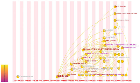 During the development of religion and visual art, researchers have conducted extensive studies by combining different subjects, including humanities, history, archaeology, anthropology, education, and philosophy. The interdisciplinary collaboration in the study of religious visual arts commenced around 2003 (Figure 5). It can be seen from the interdisciplinary network with the time zone that the study of religion and visual art was initiated by the discipline of “religion” earliest, followed by the involvement of sociology, anthropology, and other disciplines. The discipline of visual arts was integrated into research in this field until 2016.
