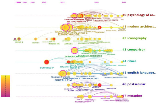 Co-citation author analysis sheds light on the collaboration and intellectual exchange among researchers in a given field. The clustering timeline of co-cited authors (Figure 6) reveals that while the intersection of religion and visual art as a subject of scholarly interest dates back to 1991, a significant uptick in literature contributions to this domain began around 2015. This surge indicates that since 2015, the study of religion and visual arts has established a more solid theoretical base. The research themes identified through co-citation in this area have been organized into eight distinct clusters, showcasing the diverse yet interconnected topics that scholars are exploring within the intersection of religion and visual art.