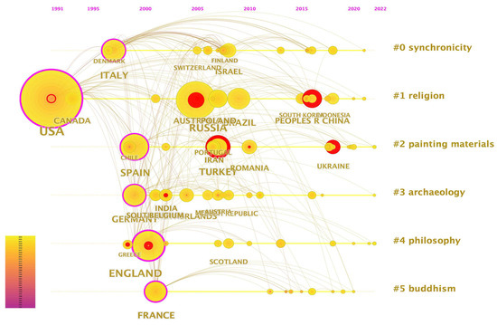 From a centrality perspective (Table 8), England and the USA are highly influential research countries, followed by France. Through the clusters shown in the timeline view (Figure 7), it is evident that the USA’s research focus on religion includes keywords such as religion, rococo, Santa Rita, semiotics, and experience. This indicates that in the 1990s, American research explored the relationship between religion and artistic styles such as rococo and Santa Rita. On the other hand, research from England leans towards philosophy and includes keywords such as religion, silence, metaphor, religiosity, Christianity, cave art, iconography, finger-fluting, and inscription.