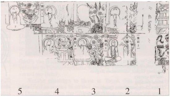 Scholars generally agree that the painting on the left wall of Cave 20 is related to the Visualization Sūtra, although the exact meanings of the different units within it are still subject to debate. There are four inscriptions written in the tall, rectangular cartouches separating the different units of this wall painting (I1–I4).5 These inscriptions are highly similar to some sentences in the Visualization Sūtra but not identical. Therefore, Ning Qiang argues that there might have once been another version of the Visualization Sūtra circulating in the Turfan area, where the scripture is believed to have been compiled (Ning 2007, pp. 133–42). Miyaji Akira is one of the earliest scholars who systematically studied these wall paintings. He identifies six visualizations taught in the sutra from this wall painting, namely, the Ground (V3), Jeweled Tree (V4), Jeweled Pond (V5), Jeweled Tower (V6), Lotus Seat (V7) and One’s Own Rebirth (V12) visualizations, and he emphasizes it as a rare example of the early mode of Sukhāvāti visualization pictures in Central Asia, before the arrival of the pictorial tradition of the Tang dynasty (618–907 CE), which conquered the Qocho Kingdom in 640 CE.6 Nowadays, Chinese academia generally accepts this theory.7